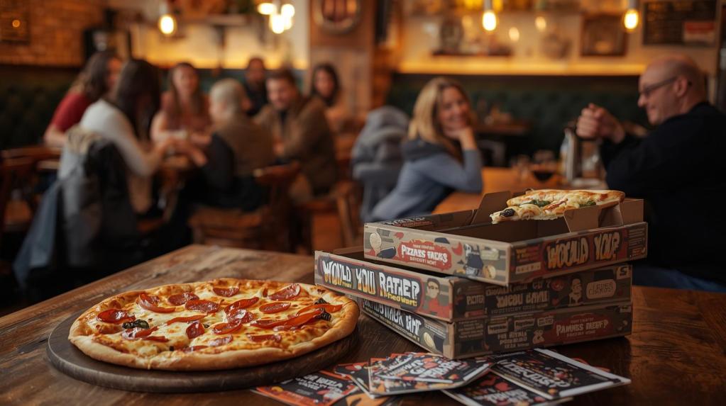 Bundle your family-size pizzas with game night kits – conversation cards, pizza-themed trivia, and simple games printed right on your pizza boxes. Partner with a local game café or create your own “Would You Rather: Pizza Edition” cards.