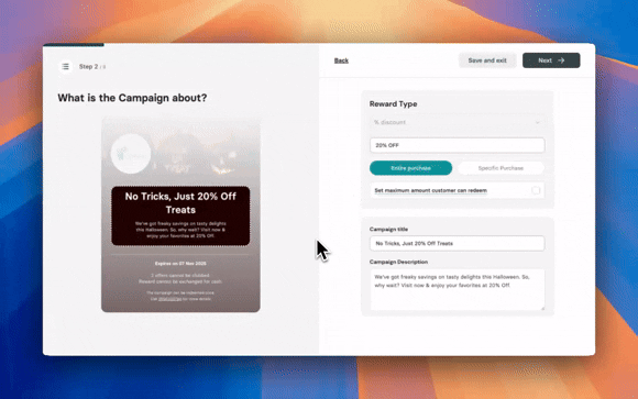Add your campaign title, reward type, description, logo, terms, and creative assets. You can also edit your WhatsApp message template here